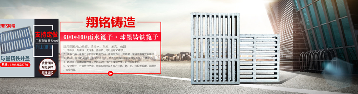 山東翔銘金屬制造有限公司擁有雄厚的技術力量,設備齊全,檢測手段完善,管理方法科學。隨著改革開放的不斷深入,市政建設正日新月異地飛速發(fā)展,本廠愿積極的態(tài)度為城市建設現(xiàn)代化做出應有的貢獻。球墨鑄鐵井蓋,雨水鑄鐵篦子,車庫篦子,排水溝蓋板,球墨鑄鐵篦子具有優(yōu)良的耐腐性能,強度高,抗強壓,抗挫,抗拉,抗沖擊及承載能力強,防盜,安全等優(yōu)點。使用說明經過國家化學建材質量監(jiān)督檢驗中心及質量技術監(jiān)督檢驗研究院的化學檢測,技術指標可長達50年之久,球墨鑄鐵井蓋是市政建設,城市綠化的選擇。多年來,本廠產品暢銷省內外,質量可靠,售后服務完善,深受廣大用戶的好評。